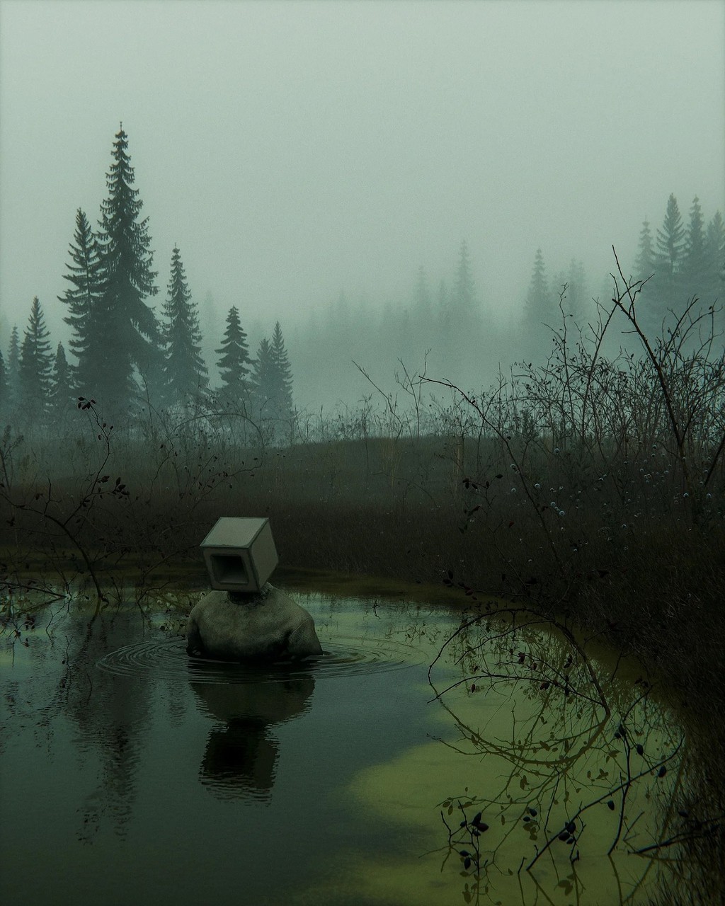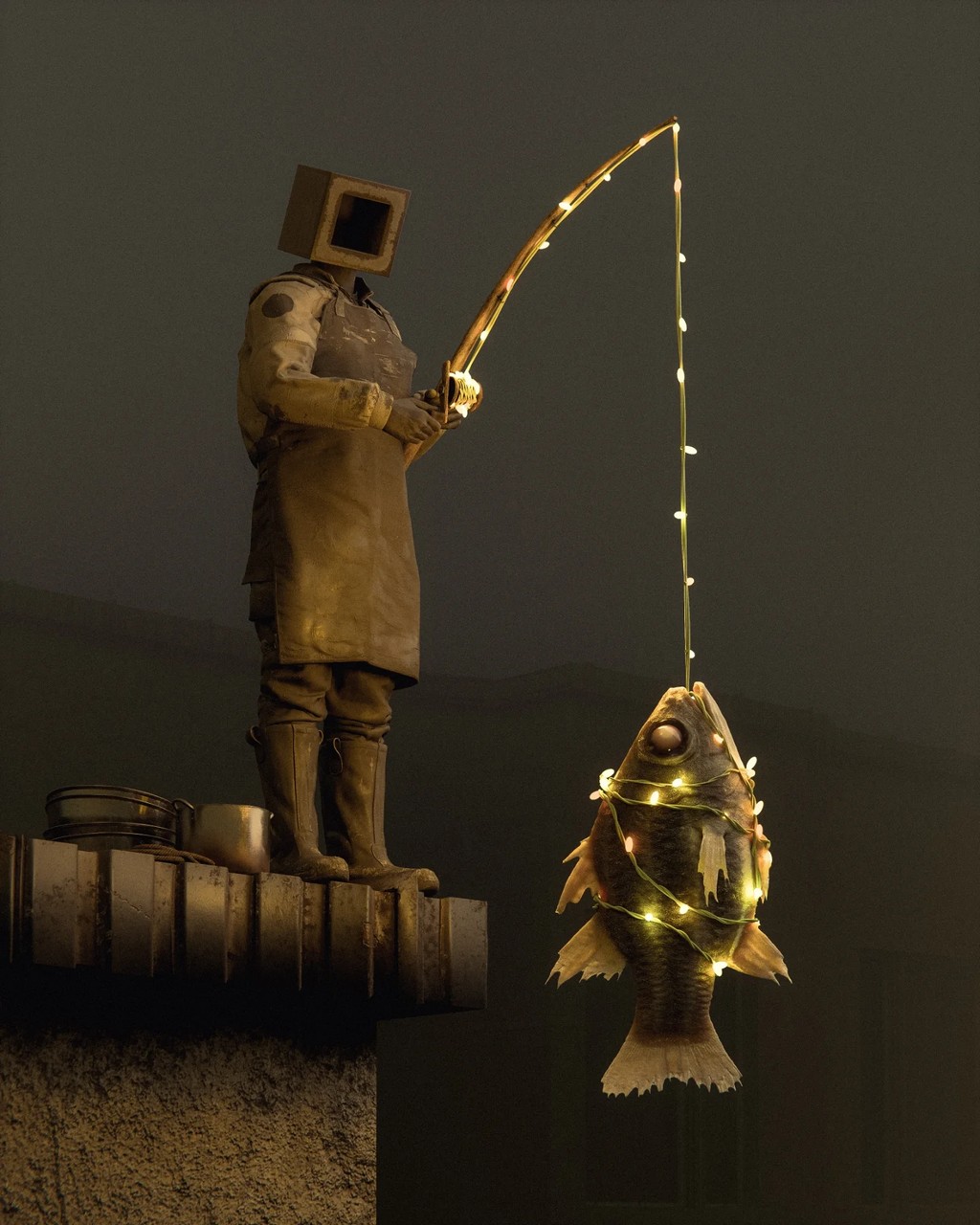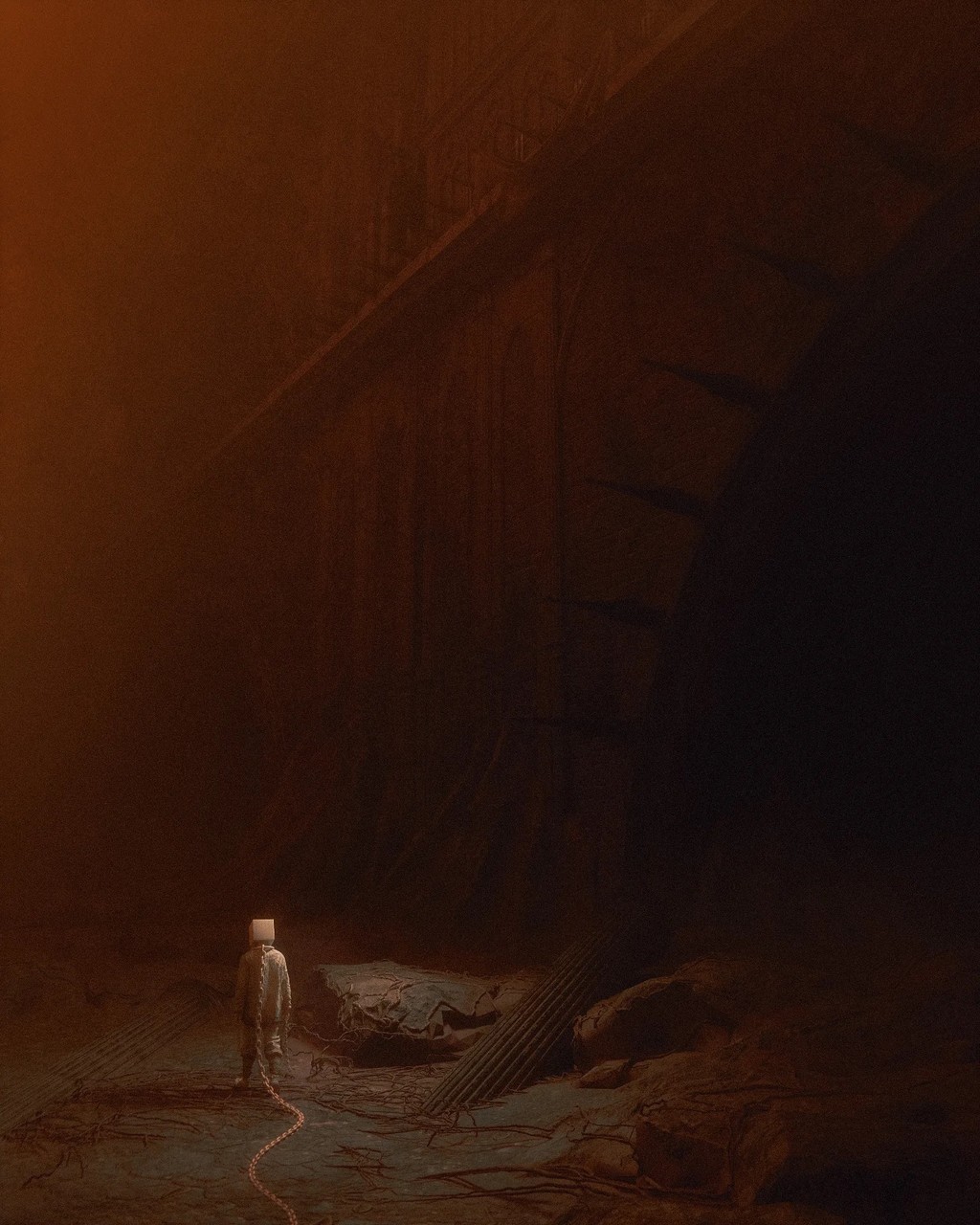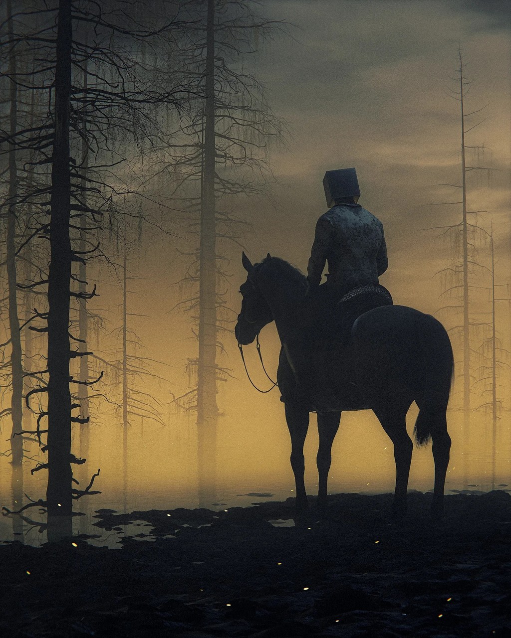 Этого канадского художника-самоучку из Монреаля, работающего в цифровом формате и известного под звучным псевдонимом Huleeb (Хулиб), в жизни Хьюго, невозможно спутать ни с каким другим 3D модельщиком. Трехмерные фотонатуралистичные картины, насколько мрачные, настолько же и атмосферные, он создаёт ежедневно на протяжении уже шести лет и делится ими на своей странице в Инстаграм. То, что начиналось как способ изучения 3D-графики в Blender, вскоре переросло в увлечение, а затем и в страсть. Создание темных и завораживающих миров, туманных пейзажей погруженных в ночную мглу, безлюдные дома и улицы с непременным таинственным персонажем, имеющим вместо головы пустой куб - своего рода визитная карточка художника. Кто это кубоголовое существо одетое в длинный милитаристский плащ и с ранцем за спиной вряд ли ответит и сам автор - то ли он пришелец с другой планеты, то ли выживший в результате апокалипсиса представитель человеческой расы, а может это киборг-андроид выискивающий оставшихся в живых людей - решать только вам. Ясно лишь одно - Хулиб просто ловит кайф от своего персонажа. Часто этого кубоида можно видеть за вполне мирным занятием вроде рыбалки или за приготовлением еды, но, временами, можно застать и в вызывающей дрожь непривычной для людей обстановке. Именно этот мистический привкус делает картины лакомым кусочком для любителей романтики Cталкера Тарковского и других запретных "зон" из НФ. Да, тут есть где разгуляться фантазии!
