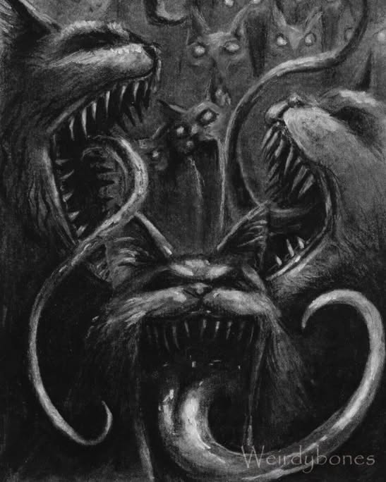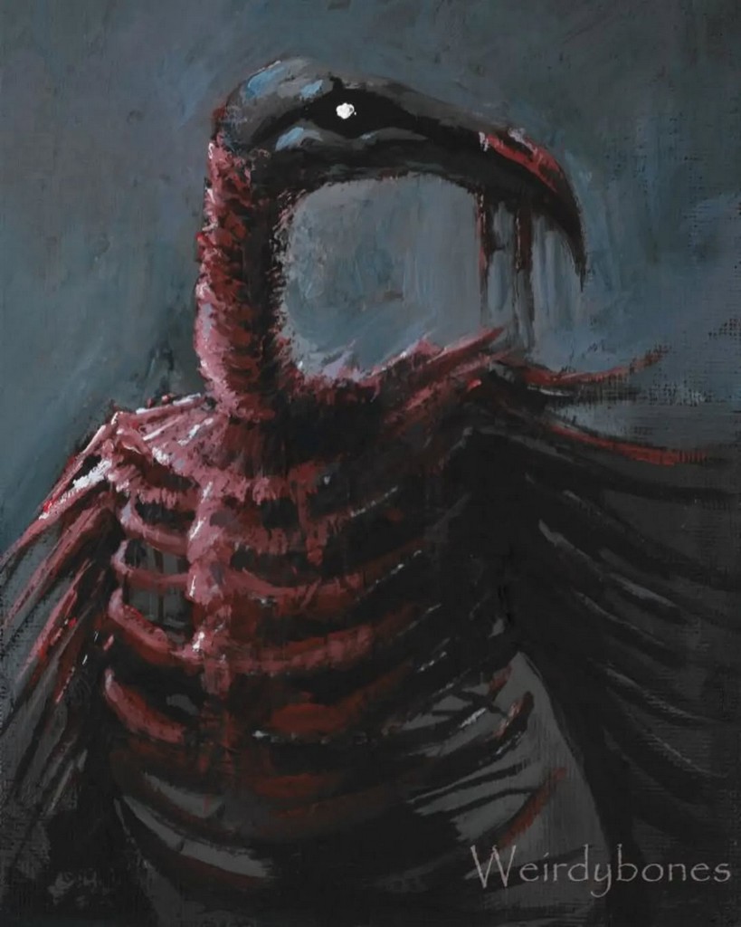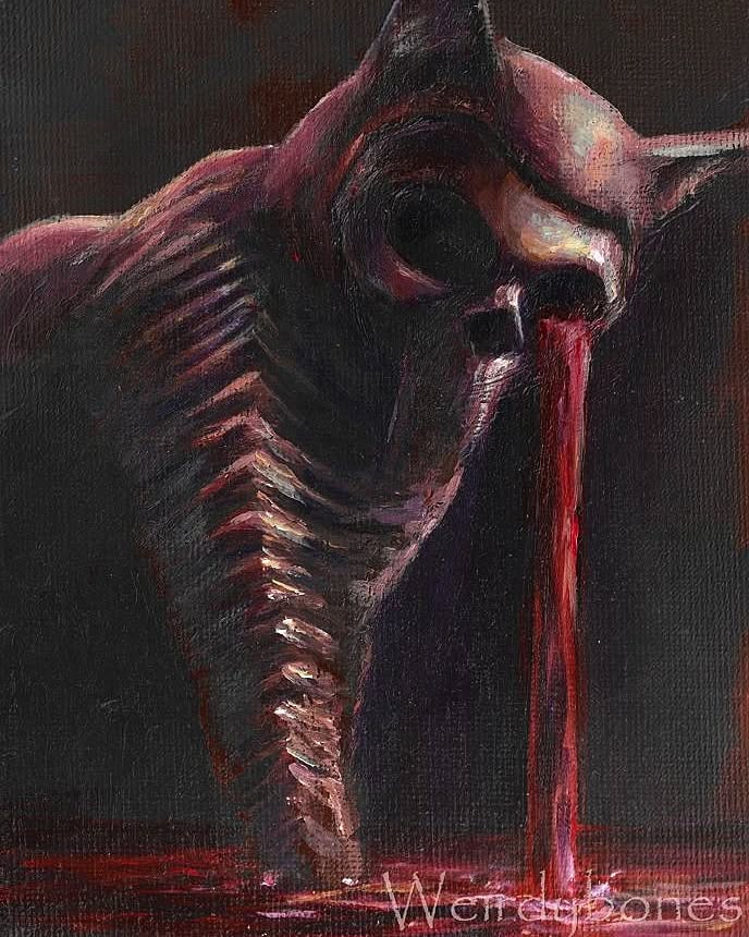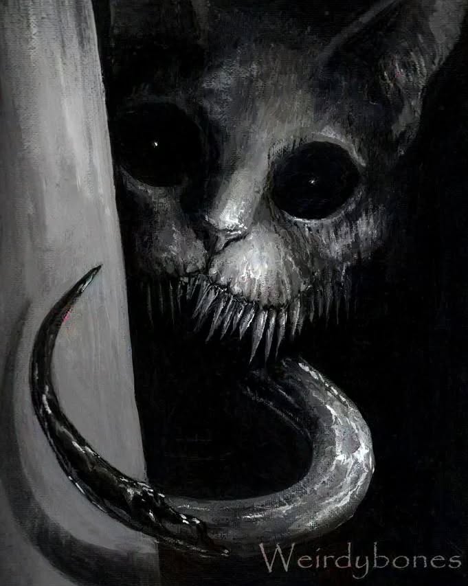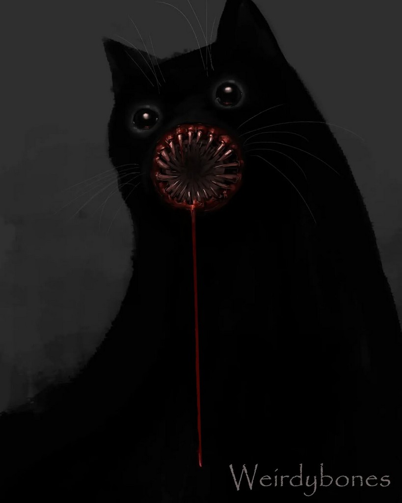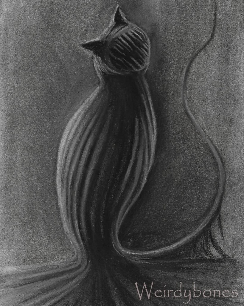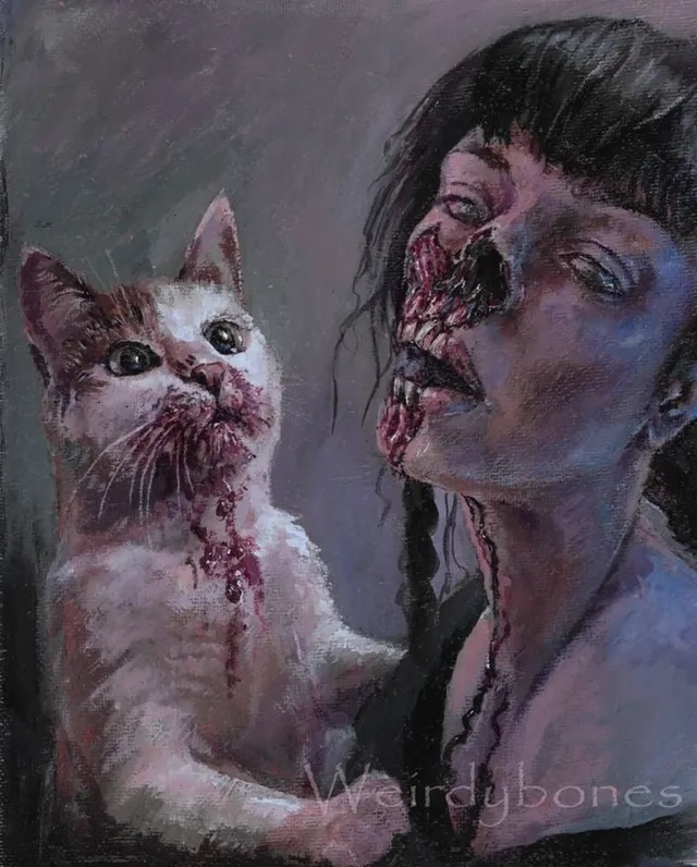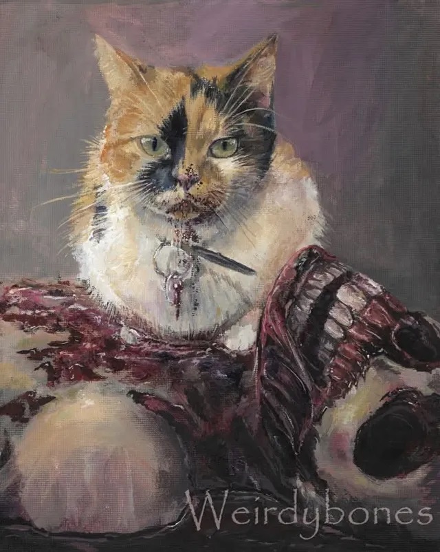 Weirdybones (Katie Beardmore) — молодая британская художница-фрилансер, создающая жуткие, тревожные и причудливые картины, часто в центре внимания которых находятся кошки. Другие темы художницы включают психические отклонения и эмоциональные проблемы. Сюрреалистичная трактовка темных закоулков нашего подсознания как ничто другое перекликается с образом черной, злой кошки, чьи образы словно впечатаны в темную канву холста Кэти и вызывают у зрителя множество ассоциаций с суевериями и мрачными предчувствиями. Почти все произведения созданы акрилом на холсте, впрочем, некоторые рисунки выполнены карандашем на бумаге. Работы Weirdybones пользуются большим спосом в среде поклонников, их можно найти как в оформлении тематических сайтов, так и в коллекциях любителей кошек, чей вкус немного отличается от традиционного. Так же Кэти сотрудничала с издателем видеоигр Rockstar Games