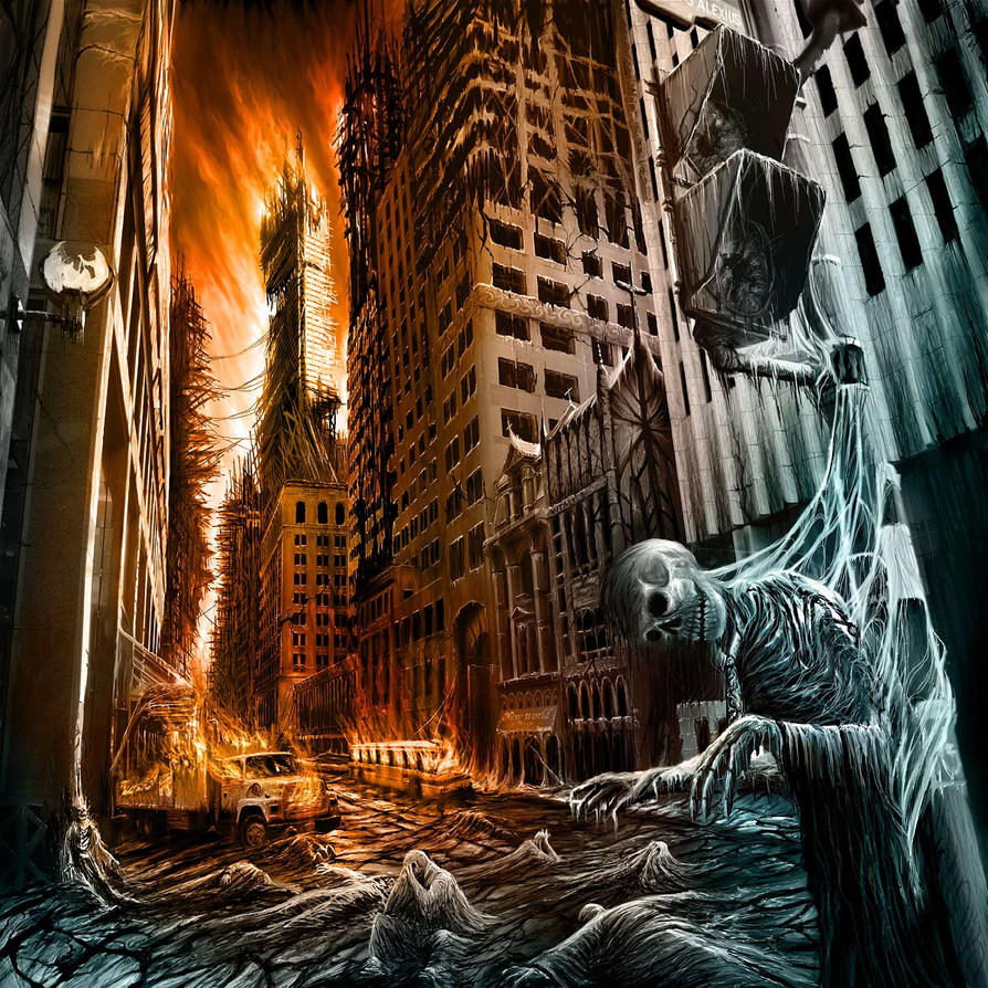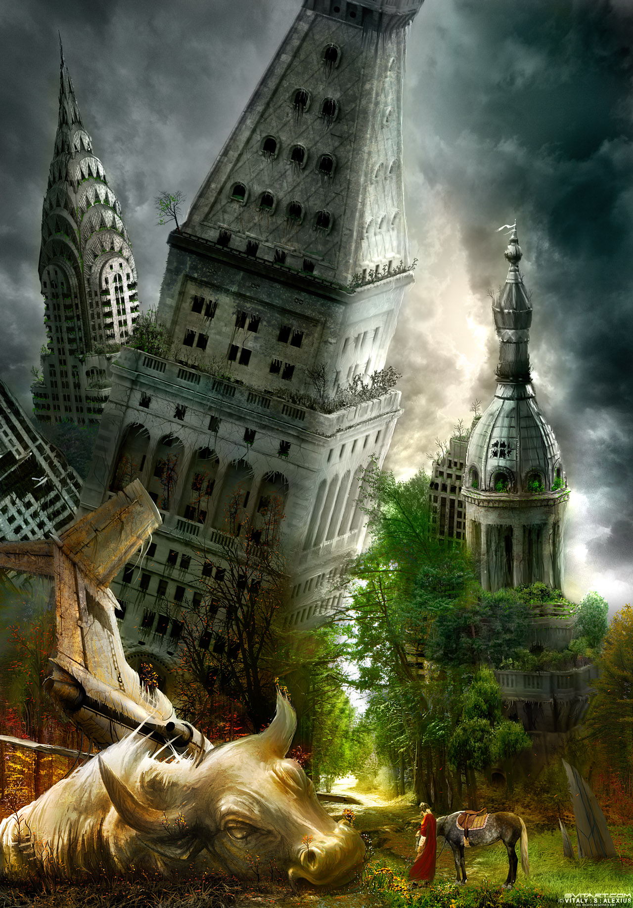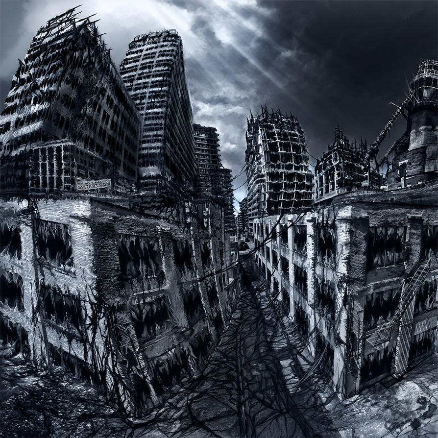 Наш с вами соотечественник, Виталий Алексиус (Самарин), эмигрировавший в недалеком прошлом в Канаду в поисках лучшей жизни тоже не прочь рассказать нам о прелестях разрухи и запустения больших мегаполисов, превратившихся в результате ядерной войны в прелестную лужайку, на которой пасуться всякие монстрообразные личности. Но не только они! Виталий таки нашел золотую середину и выразил декаданские картины в выигрышном свете, не зря он сам называет свое творчество романтическим апокалипсисом (Romantically apocalyptic).